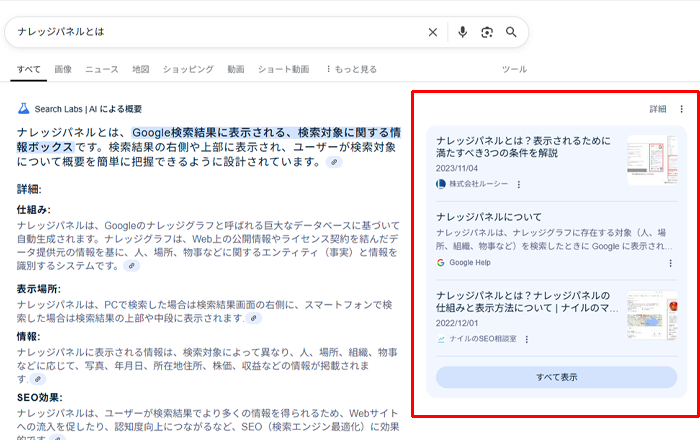 ナレッジパネルとは、Google検索結果ページの右側(PC版)や、スマホの場合は最上部に表示される、特定のテーマに関する要約情報をまとめた専用ボックスのことです。